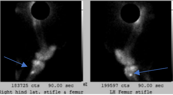 In Polly’s case, a full body bone scan was performed and identified marked, focal regions of increased radiopharmaceutical uptakes in the tibia and the radius. This is a highly unusual finding, but our specialist team of sports medicine vets efficiently diagnosed Polly with enostosis-like lesions or ‘bone islands’.  Bone islands are defined as single or multiple regions of new bone in the medulla of long bones near nutrient foramens and are highly uncommon; The exact cause of this phenomenon is unknown but it can affect many bones simultaneously.