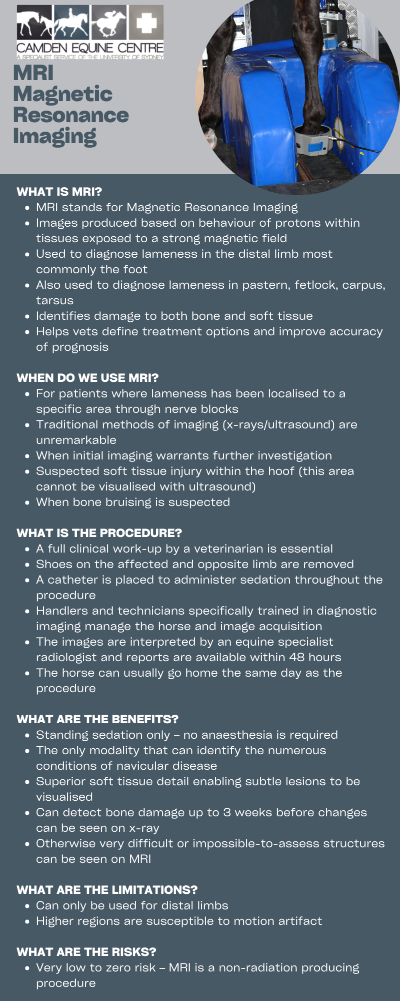 Magnetic Resonance Imaging, commonly known as MRI, is a high-end diagnostic imaging service offered at CEC. Most often used to diagnose lameness in the distal limbs when traditional forms of imaging (x-ray/ultrasound) have not shown any findings. Here is a quick guide on what is involved in an MRI and how it can help diagnose issues in your horse.